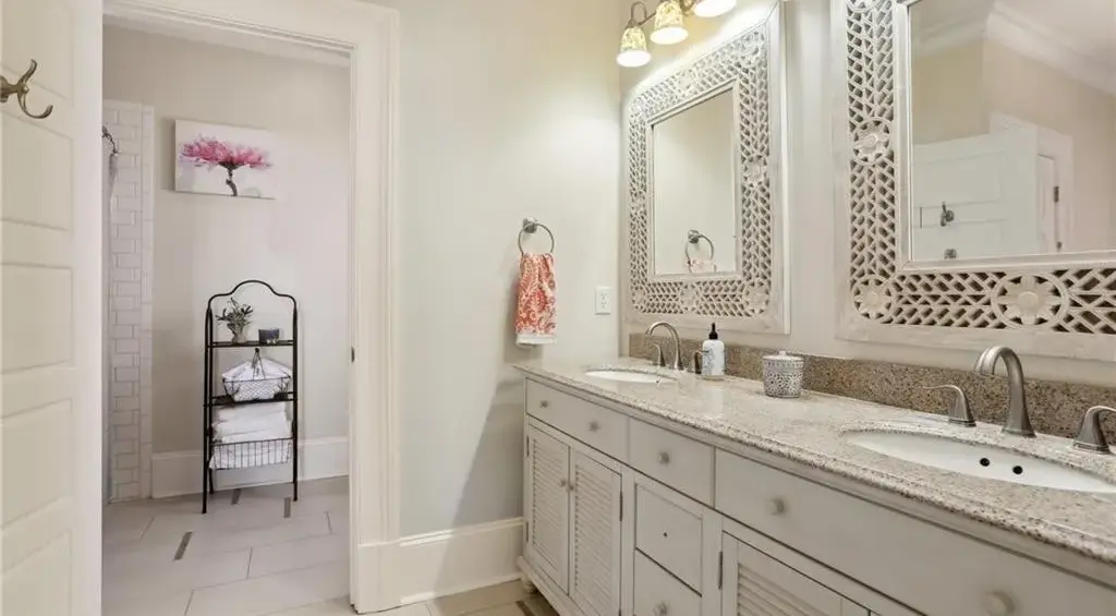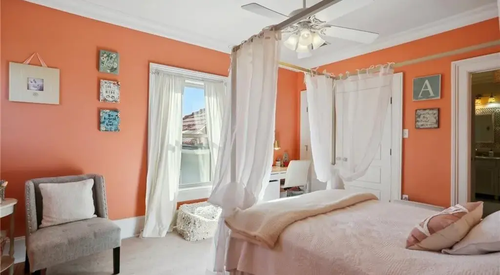 Inside, the open-concept living area showcases vaulted ceilings with exposed beams, hardwood floors, and a custom kitchen with stainless steel appliances and a large island. The home blends rustic and contemporary elements with shiplap walls, elegant chandeliers, and intricate woodwork, creating a warm and inviting atmosphere. This home is a perfect mix of style and comfort in the heart of the historic Treme neighborhood.